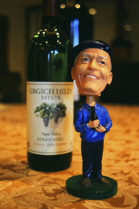 酒莊創辦人暨釀酒師格其屈(Mike Grgich)的公仔;後頭則是酒莊所釀製的的金芬黛(Zinfandel)品種紅酒。